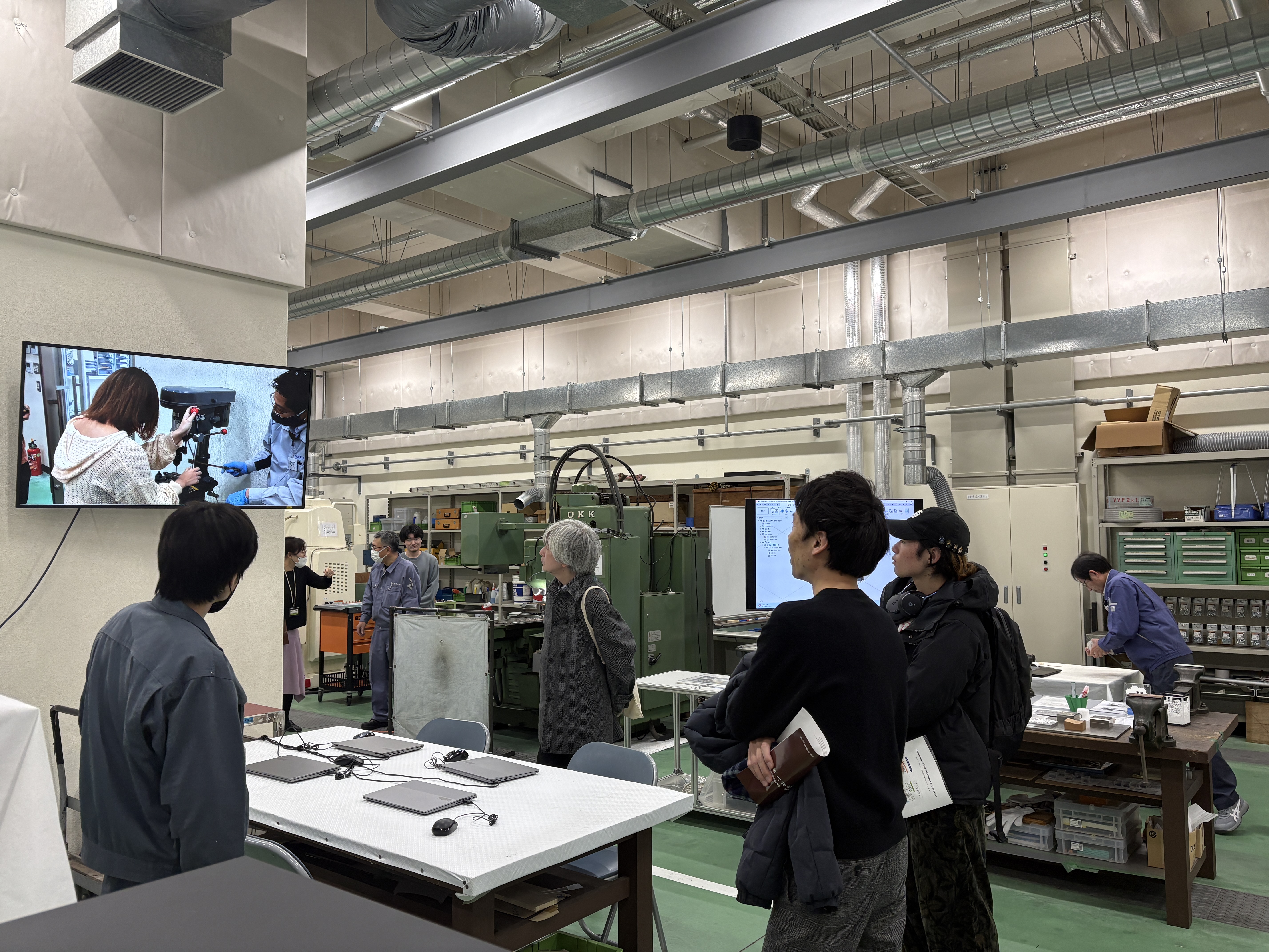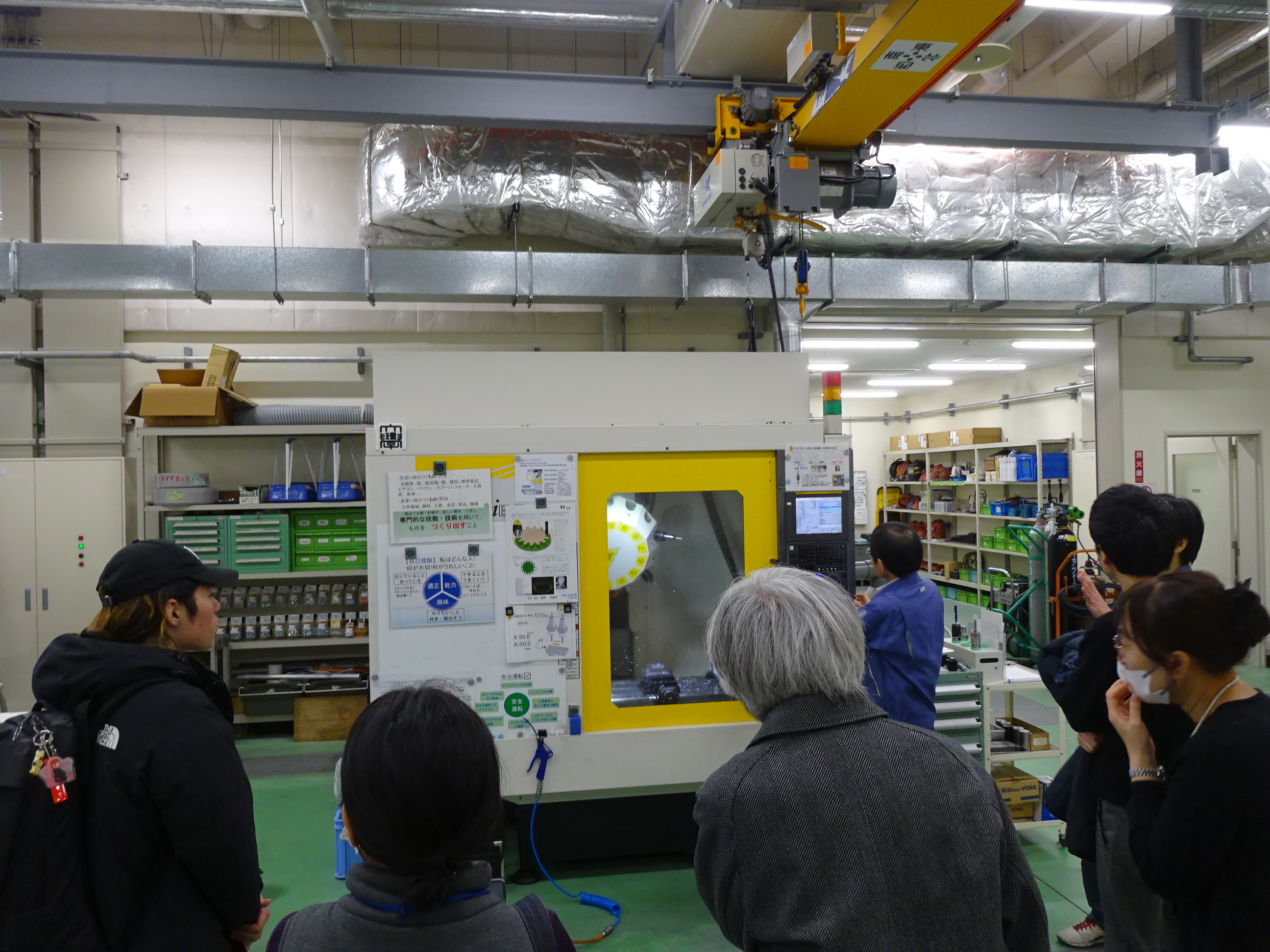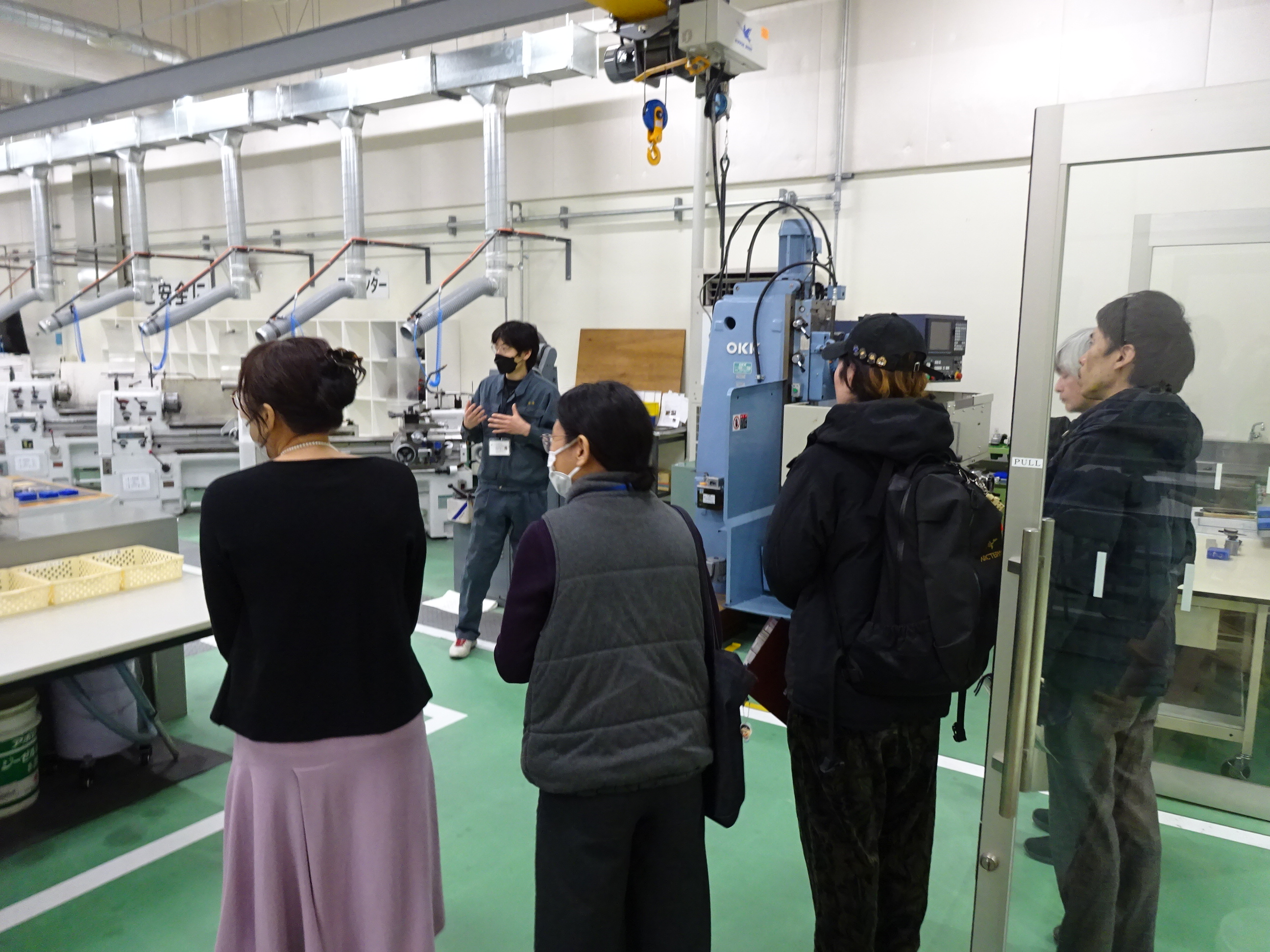 その次に、A1号館地下1階にある工作センター(サイエンスドリームラボ)に向かい、見学を行いました。各工作機器の解説と共に工作の道のり、作製できる製品例を挙げることで、工作機器への関心を深めていただきました。